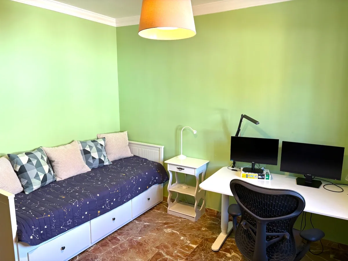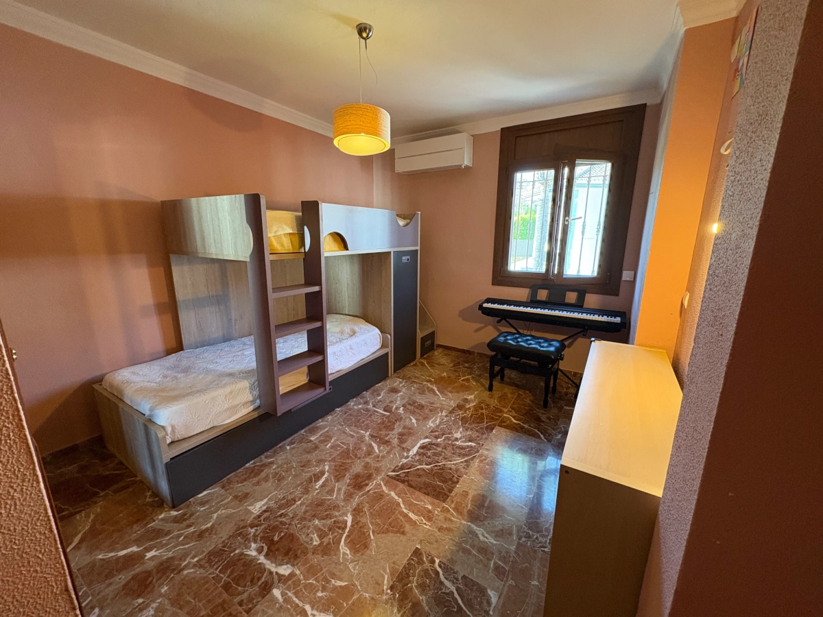 Set on a 1,000 m² private plot, the property features two independent homes, ideal for families, guests, or rental opportunities. The upper floor offers a bright three-bedroom residence with generous living spaces, a large kitchen, an office, and a playroom — perfect for modern family life. The ground floor includes a fully equipped two-bedroom apartment with two bathrooms, one of them conveniently connected to the pool area.