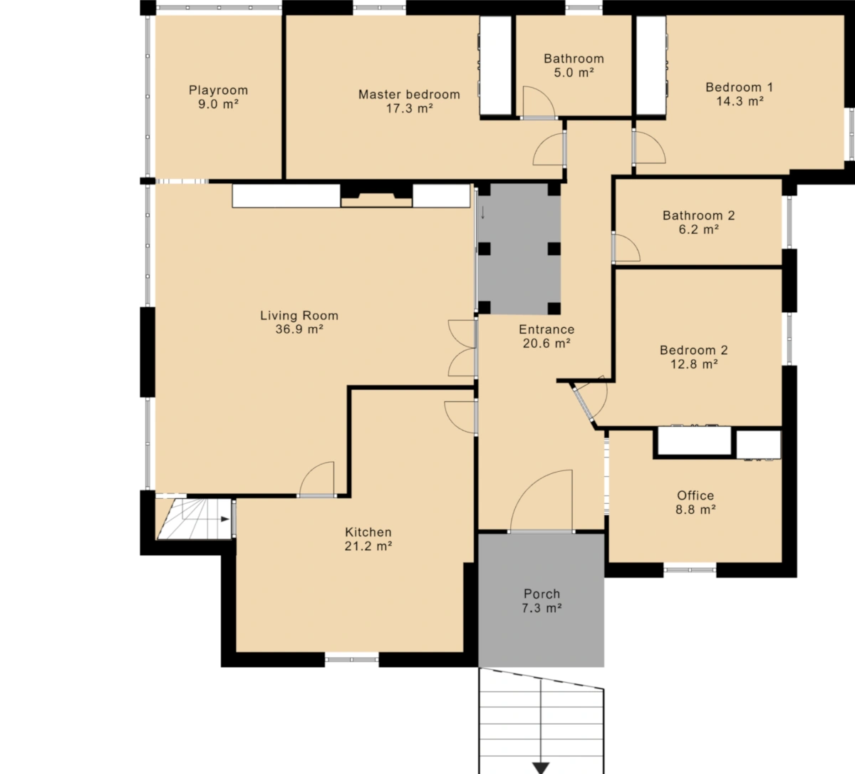 Bright and inviting, the upper level is the heart of family life — with an open living and dining area, a large kitchen, and plenty of light throughout. Three comfortable bedrooms, including the master suite, are joined by an office and a playroom, creating a practical layout where everyone has their own space.